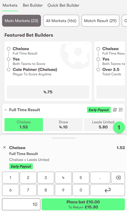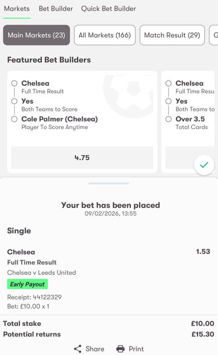 - Choose a market, enter your stake, and click ‘Place bet’