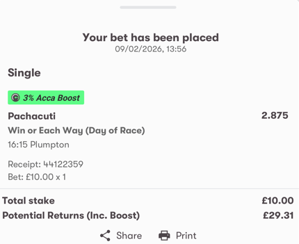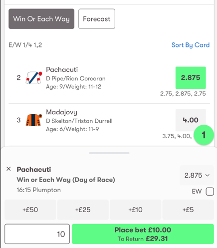 - Choose a horse, enter your stake, and click 'Place bet'