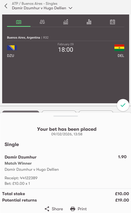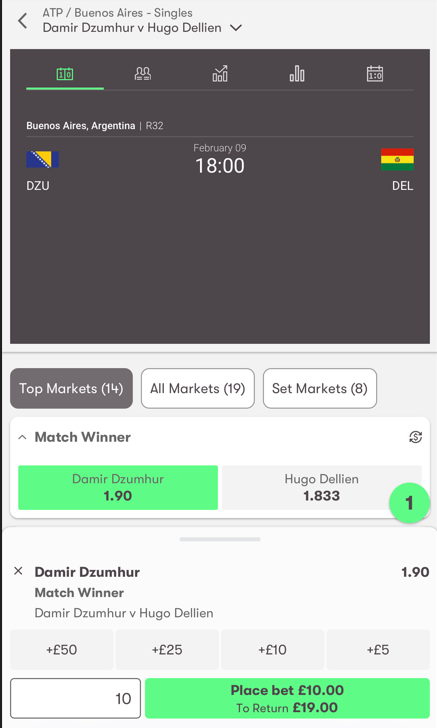 - Choose a player, enter your stake, and click 'Place bet'