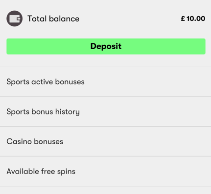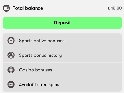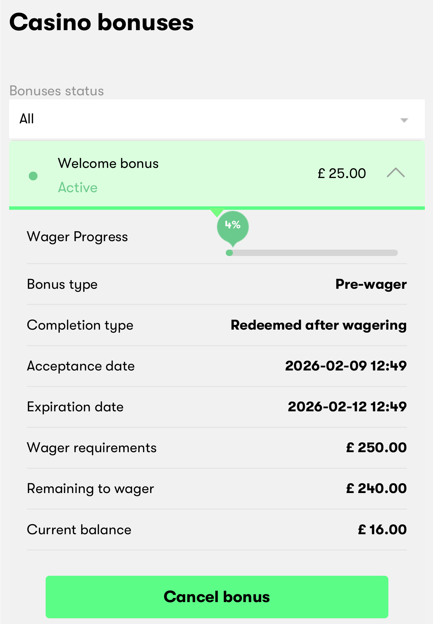 2. Go to ‘Sports active bonuses’, ‘Casino bonuses’ or ‘Available free spins’