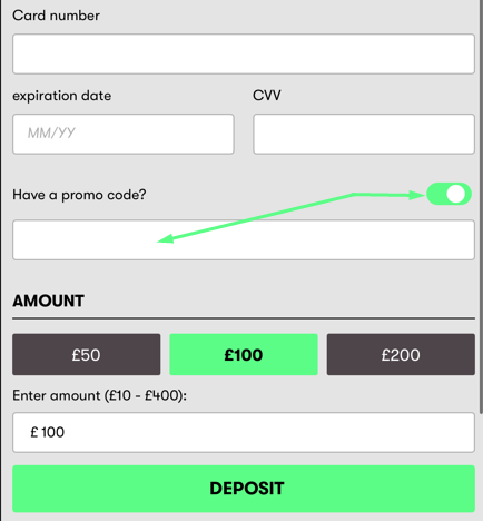 2. Enter your payment details and your promo code in the ‘Have a promo code?’ field and click ‘Deposit’